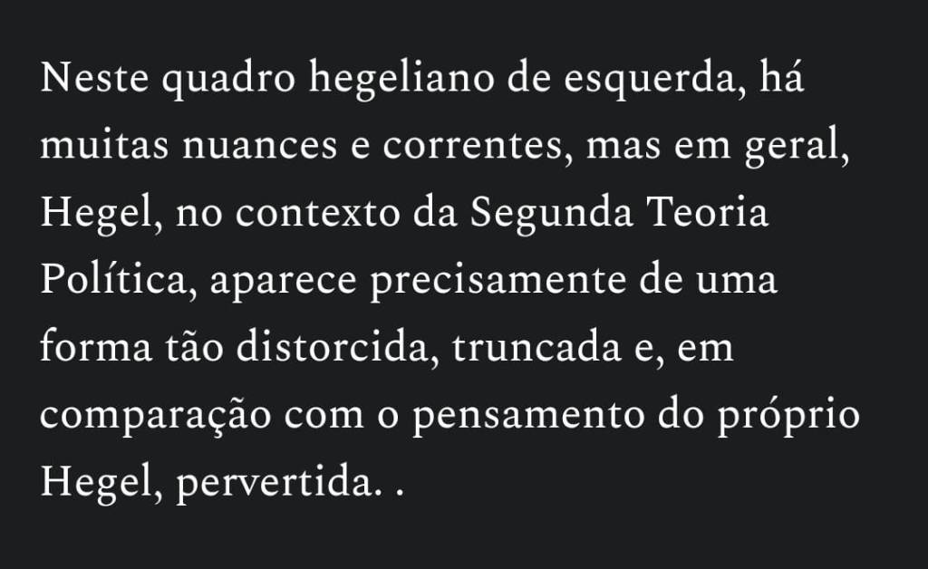 Neste quadro hegeliano de esquerda, há muitas nuances e correntes, mas em geral, Hegel, no contexto da Segunda Teoria Política, aparece precisamente de uma forma tão distorcida, truncada e, em comparação com o pensamento do próprio Hegel, pervertida.